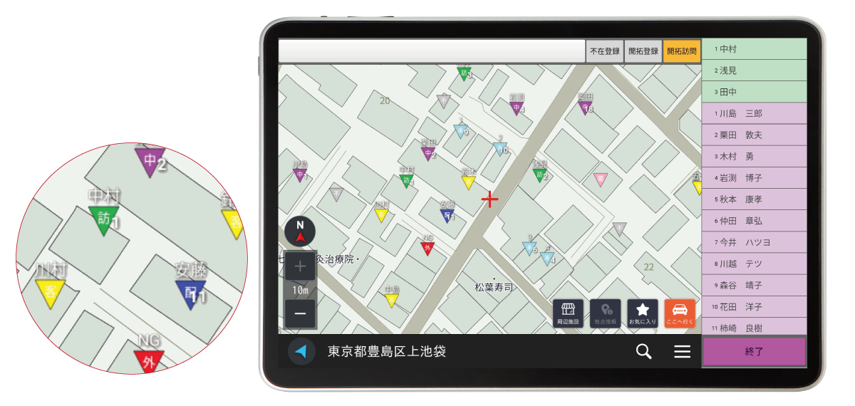 代配など、持ち運び便利なタブレット地図機能。営業活動に使える機能をプラスしたバージョンもご用意。必要機能に応じてタイプをお選びいただけます。